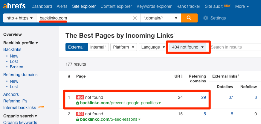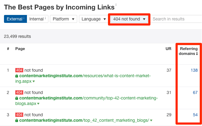 Site Explorer (网站分析)> enter competitors domains(输入竞争对手域名>) > Best by links > add a “404 not found” filter > sort by number of referring domains from high to low(按推荐域名数量从高到低排序)