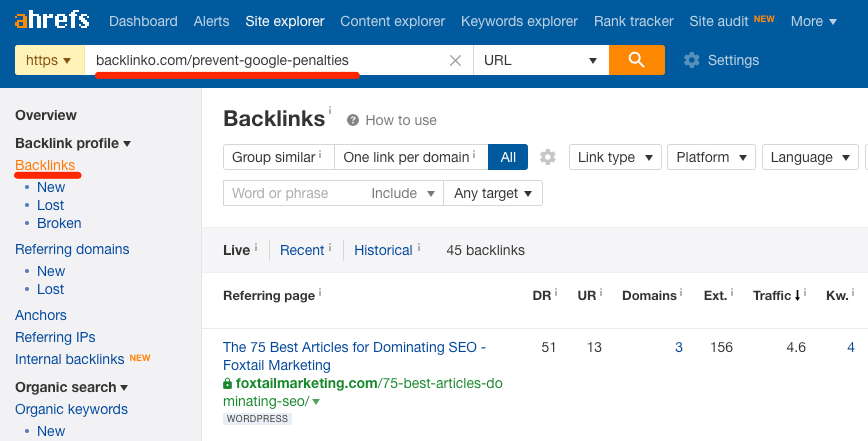 这种情况下,避免惩罚的话题与SEO相关,SEO话题我们在Ahrefs博客上提及过。它有来自29个推荐域名的链接。