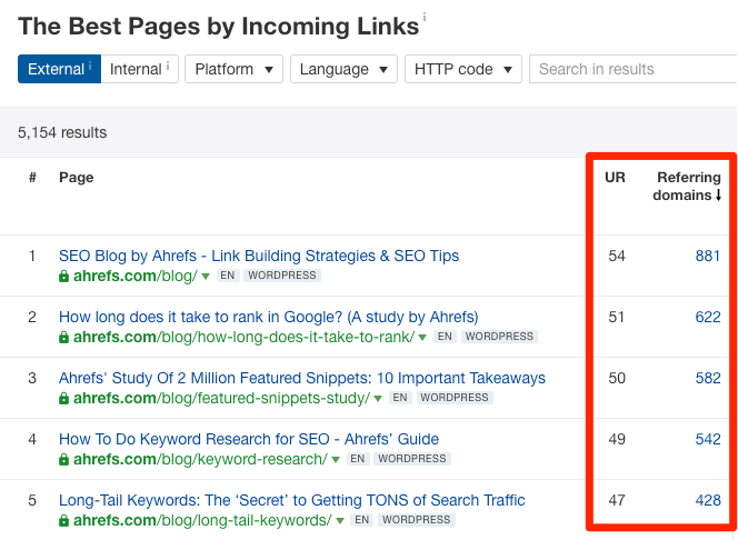 我们可以ahrefs提供的网站分析里面的按外链数量排序报告。