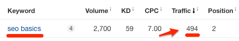 从这里我们看到排名比我们高的网页每个月从“SEO基础知识”这词中获得了494预估自然流量,比我们400的自然流量高了23.5%还多。