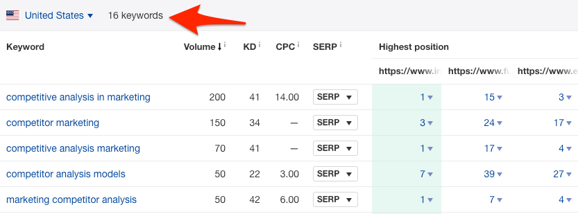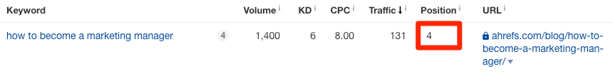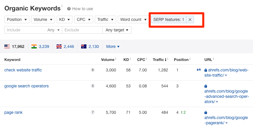 其中一种办法就是复制关键词列表到Ahrefs的排名监控。它会告诉你在目标国家/地区中,(你的)每个关键字的排名位置。