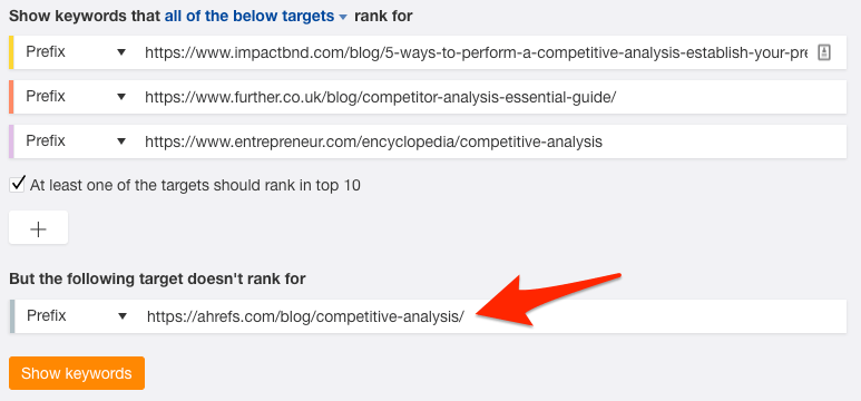 这次,我将选择“显示以下所有目标的关键字”排名的选项。 我还将勾选“至少一个目标应该排名前10位”复选框,以保持结果尽可能相关。 然后,我将点击“显示关键字”。