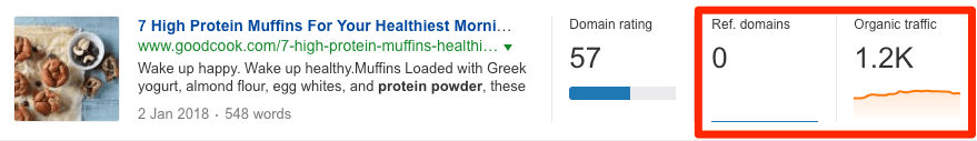 假如我们点击详细下拉符查看“自然搜索关键词”标签,我们发现有排名的关键字与高蛋白松饼有关。他们的关键字难度得分都很低。