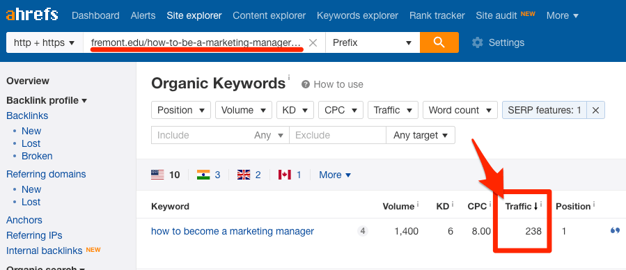 通过Ahrefs网站分析,我们看到当前排名第二的网页的预估自然搜索流量。