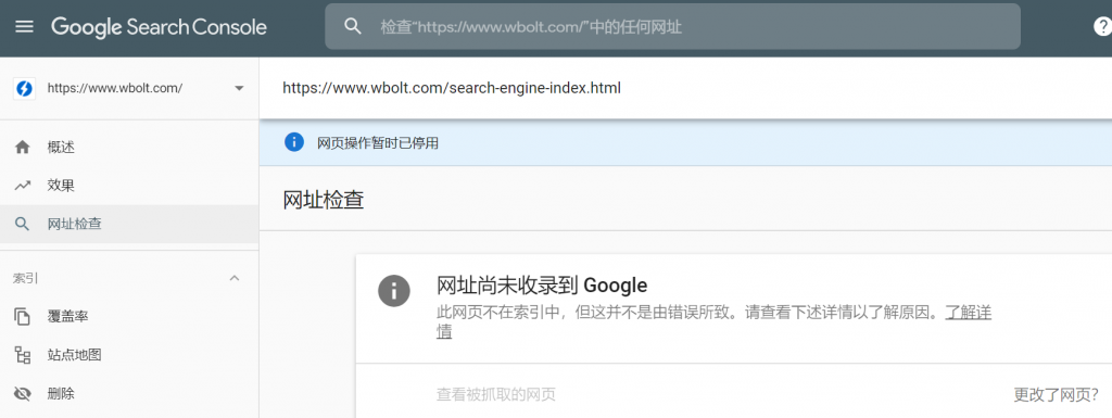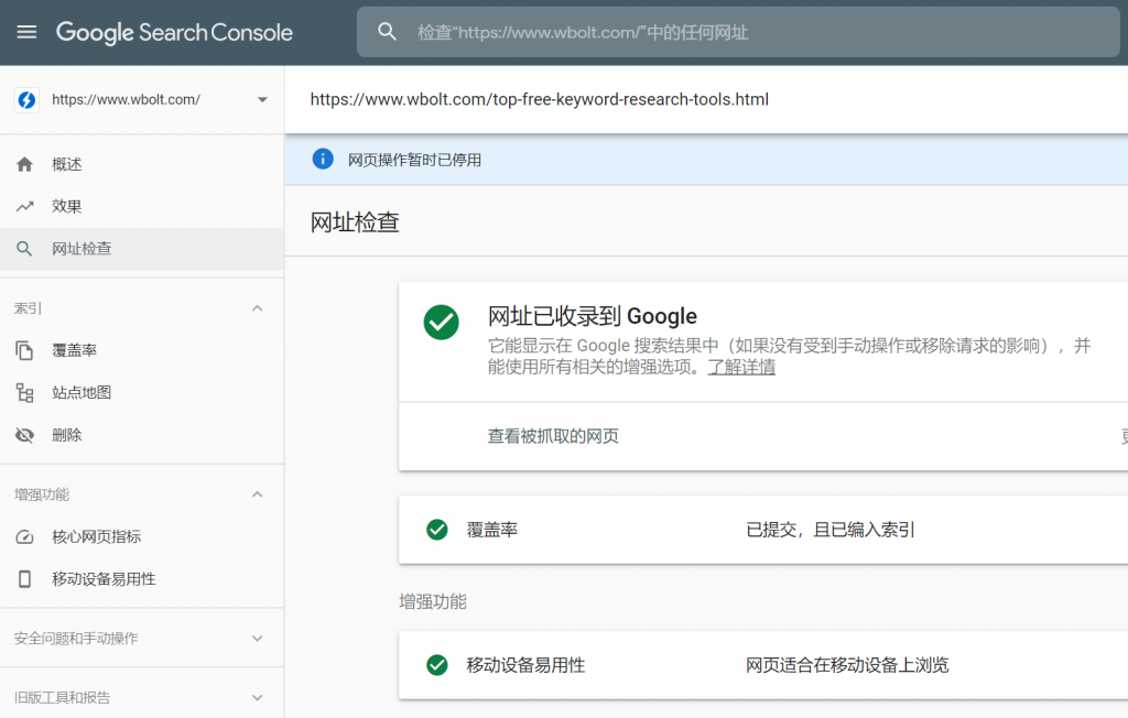 除上述site命令的方法,你也可以使用Google Search Console来检测特定页面是否被谷歌索引。你只需要将页面URL放入URL检测工具中。