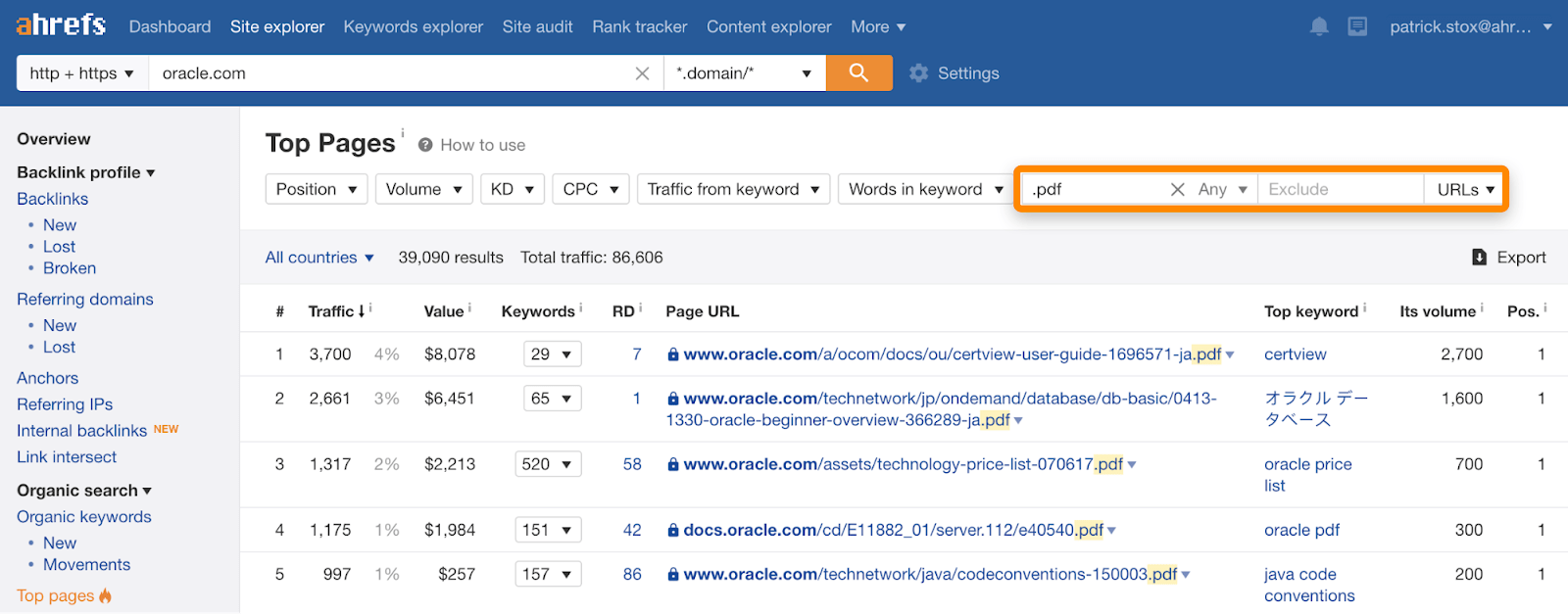 译者注:打开Ahrefs,点击导航栏的网站分析(Site Explorer),并且把你想搜索的网站的域名放到输入框里。点击侧边栏的Top Pages,在搜索菜单里选择“Any”且输入包含“.pdf”的页面。