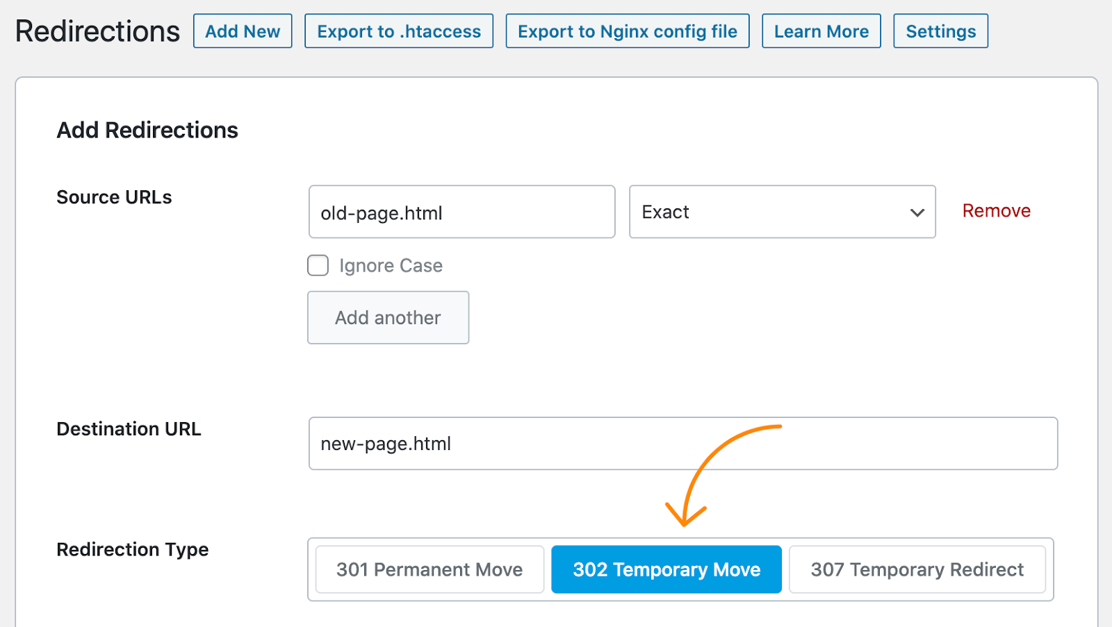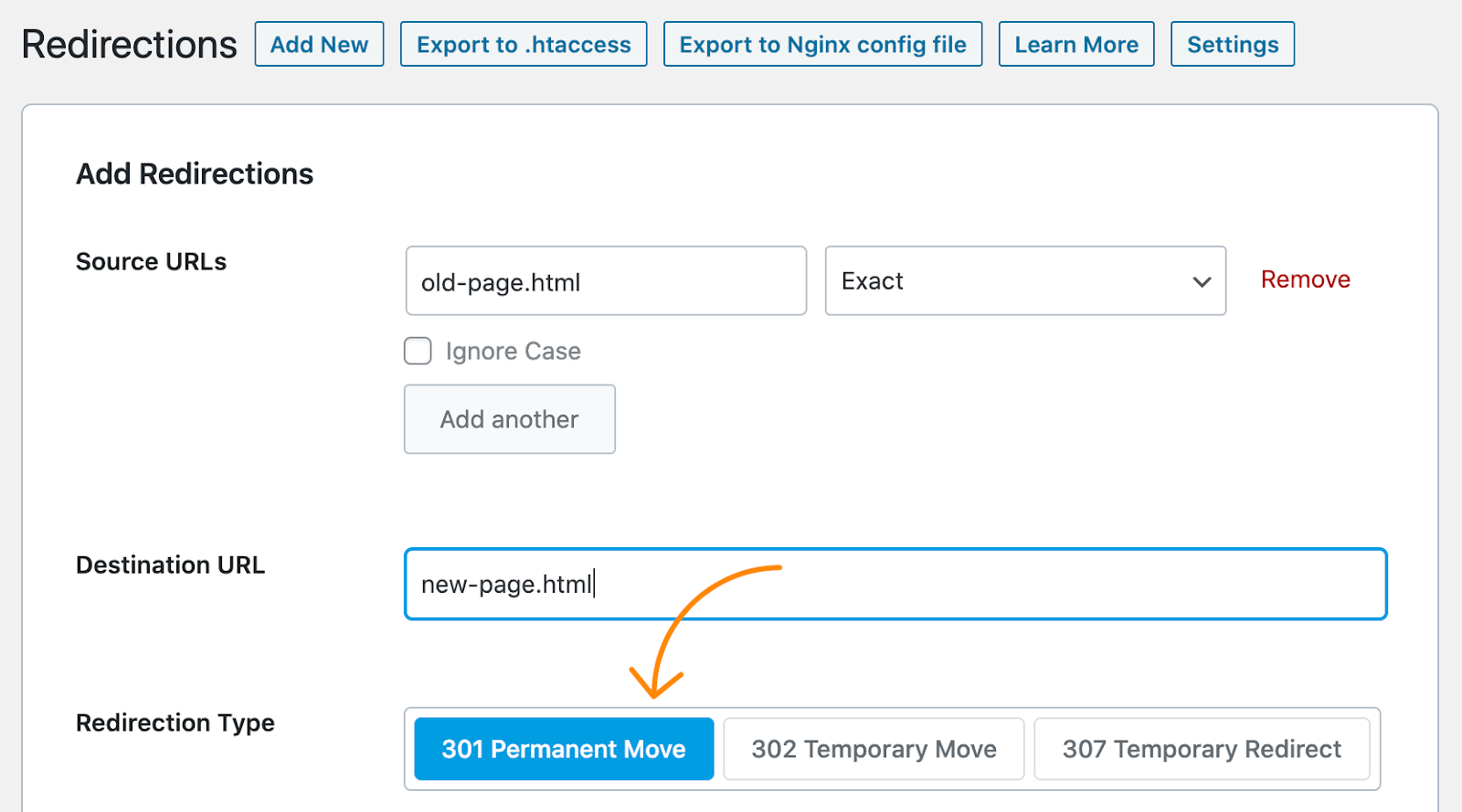 你也可以使用 RankMath 或“重定向”插件来执行此操作。只需选择所需的重定向类型,然后添加源 URL 和目标 URL。
