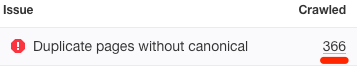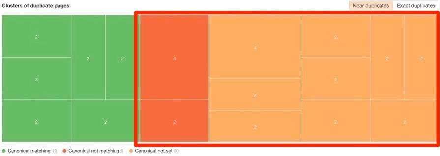 你还能找到没有设置权威标签或者标签标签不符的近重复页面。他们在同一份报告中以红色和橙色区块显示。