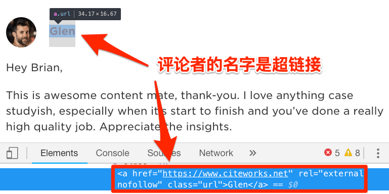 你看,当有人提交博客评论时,WordPress 会底部他们的姓名和网站。接着,当评论生效时,名字就会链接向他们(提供)的网站。