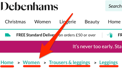 面包屑导航可以让访客(和搜索引擎)有一个清晰的轨迹来浏览你的网站。他们看起来像下面这样: