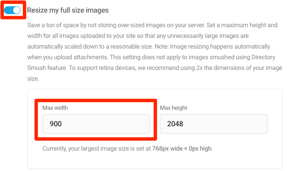 你会想着改变“max width”(“最大宽度”)以适应 WordPress 的主题。将它设置成能够在你网站展示的最宽尺寸。如我们来说,这个值是 900px。