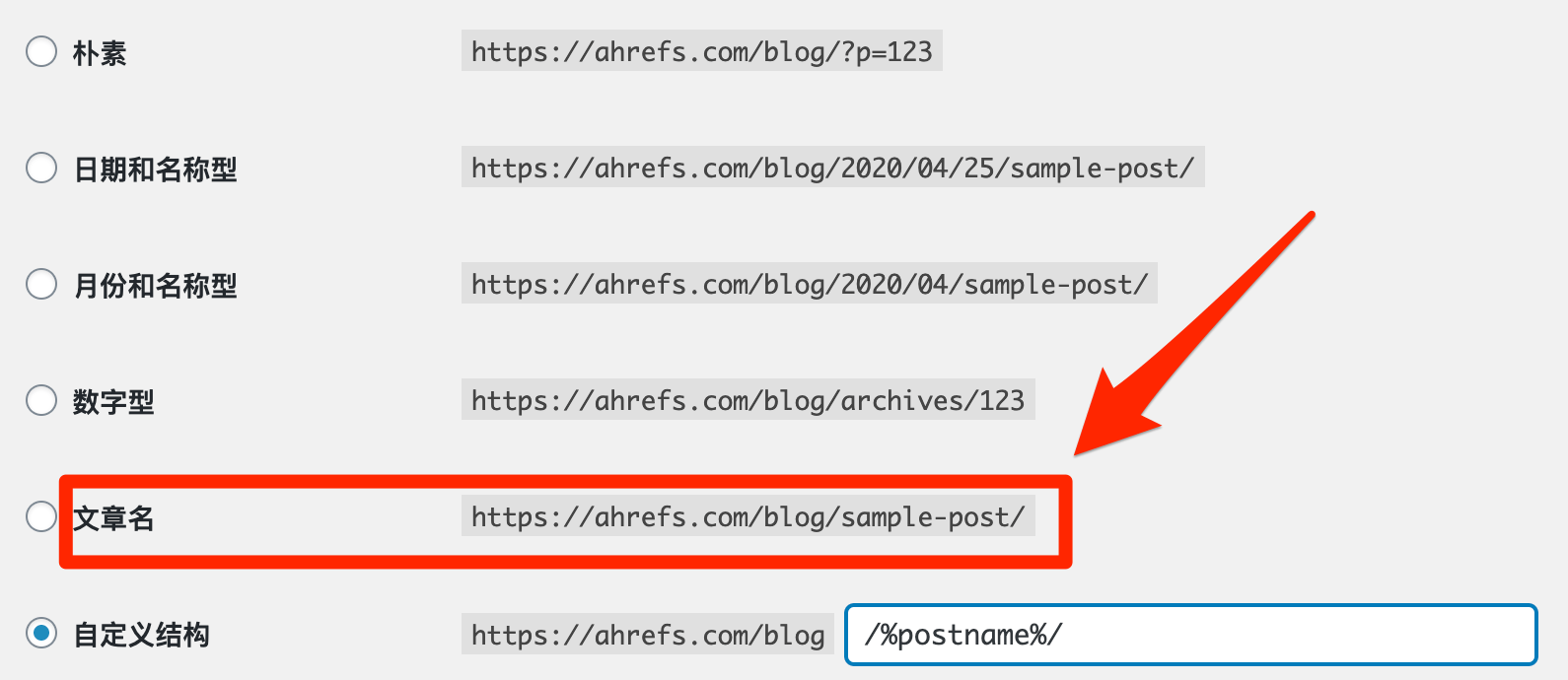 你可以看到包括朴素、文章名、数字型等在内的选项。我们一般建议选择朴素类型,或者自定义结构(格式为/%postname%/或者/%postname%.html)
