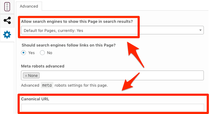 你可以在下拉菜单中选择“不”来取消搜索索引对这一页面的索引。或者将首选版本的 URL 粘贴进“Canonical URL”框中。非常简单。