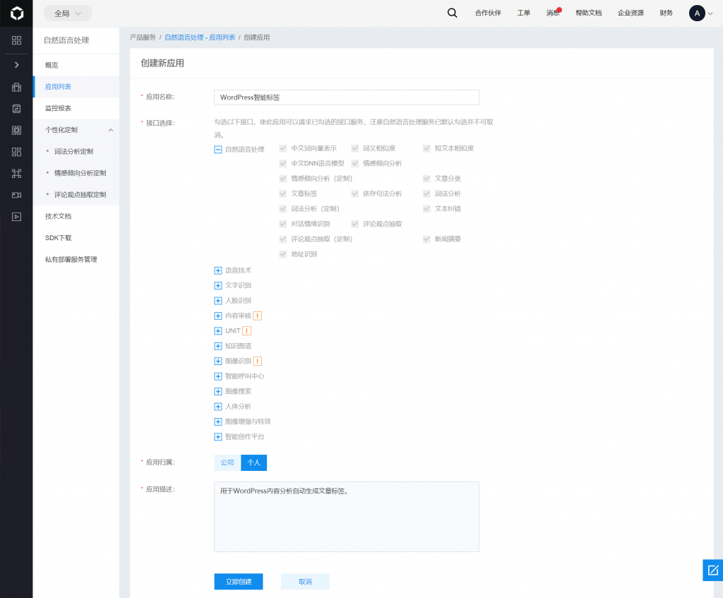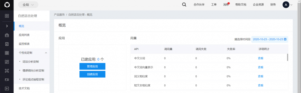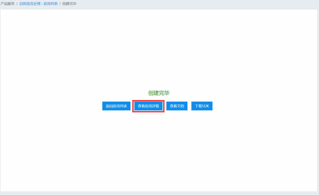 在自然语言处理产品服务详情页面,点击“创建应用”;