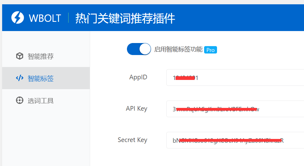 进入WordPress后台,点击“设置-热门关键词推荐插件”,进入插件设置页面后,切换至“智能标签”,打开启用智能标签功能开关,将上面获取到的百度智能云应用信息复制到对应位置,如下图所示: