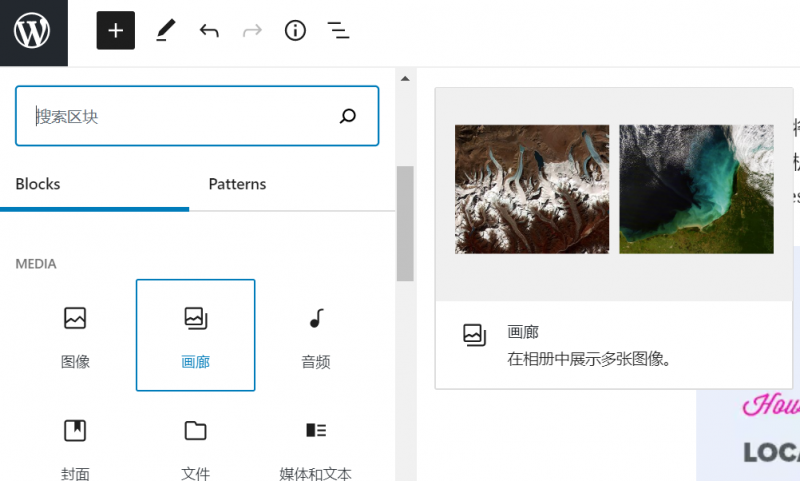 要创建画廊,文章发布界面单击“+”添加区块图标,选择Media下方的“画廊”。