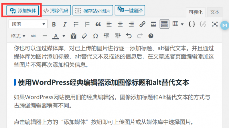 点击编辑器上方的“添加媒体”按钮即可上传图片或从媒体库中选择图片。