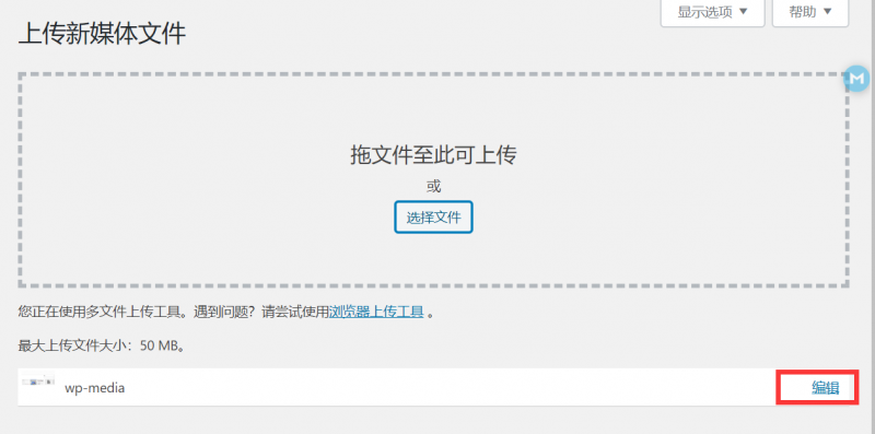 成功上传后,在“上载新媒体文件”框下方即可看到上传图像,点击图像对应的“编辑”链接。