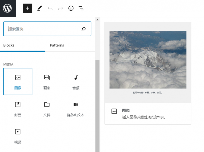 在古腾堡编辑器,点击编辑器右上角的“+”添加区块符号,选择“图像”块。