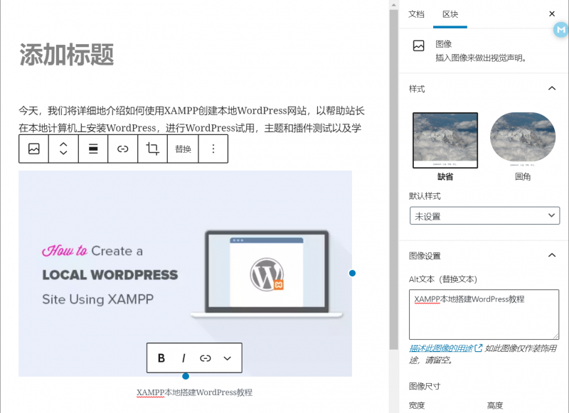添加图像后,图像将放入编辑器中,并在其下方带有一个标记为“编写说明…”的文本框,即为图像添加标题,而在右侧的区块信息,你还可以填入Alt文本属性(替换文本),如下图所示: