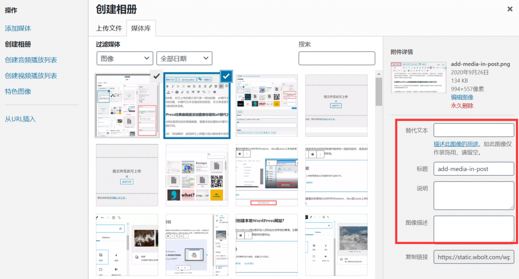 使用“ 经典编辑器”创建画廊时,还可以为图像添加替代文本属性、标题、说明和图像描述等信息。只需上传并选择多个图像,然后单击左列中的“创建相册”链接。
