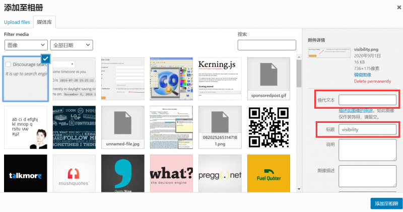 那么平日我们通过媒体库直接上传图片时,如何为图像添加标题和alt标签替代文本呢?其实,在上一章节已经稍微提及,下面是更详细的教程:
