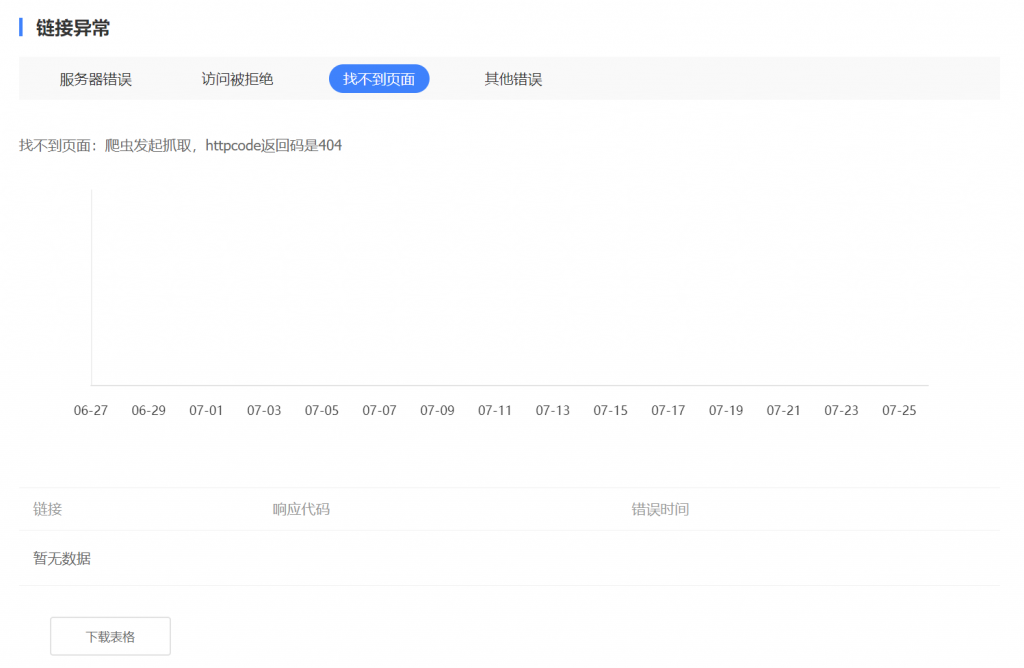 通过百度搜索资源平台的数据统计-抓取异常,选择“找不到页面”选项卡,我们也可以找到404错误链接清单。