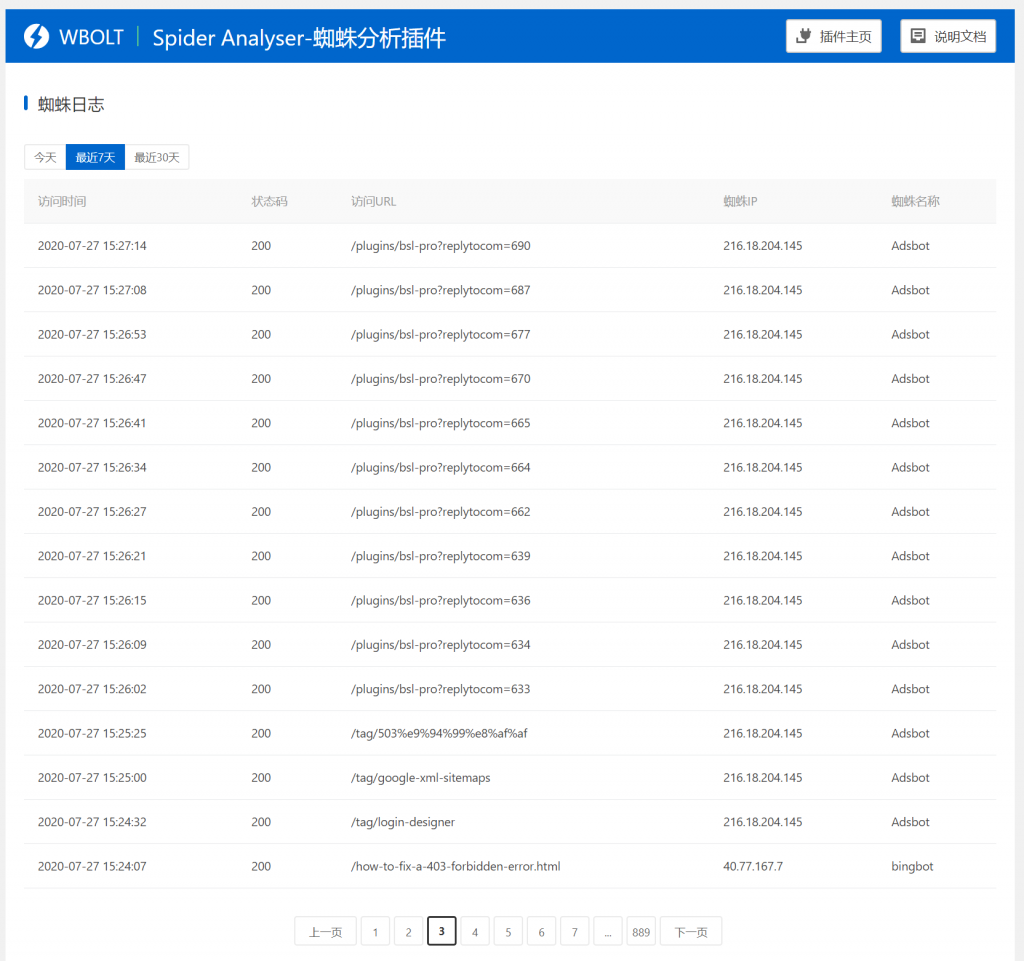 其中蜘蛛分析插件可以实时检测搜索引擎爬虫踪迹,对所有搜索引擎蜘蛛爬取网站URL的数据进行统计,包括爬取链接、状态码及蜘蛛名称等。