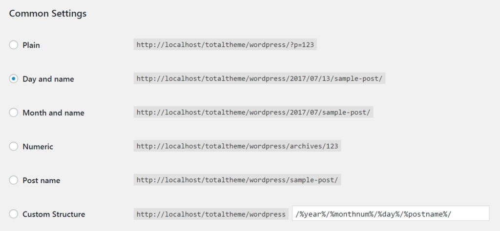 有一些是基于数字的(例如普通和数字选项),这并不理想,因为它们向搜索引擎传递很少有用的信息。相反,最好使用“post name”结构,因为它可以清楚地传达链接内容的内容。通过访问站点的后台并导航到“设置>固定链接”,您可以轻松地更改固定链接结构(或创建自定义结构)。