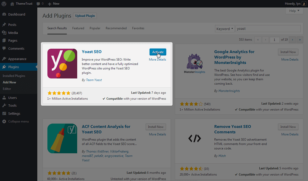 Yoast SEO可以在WordPress插件库搜索获取,通过“WordPress仪表盘”-“插件”-“安装插件”搜索yoast,点击“现在安装”-“启用”。