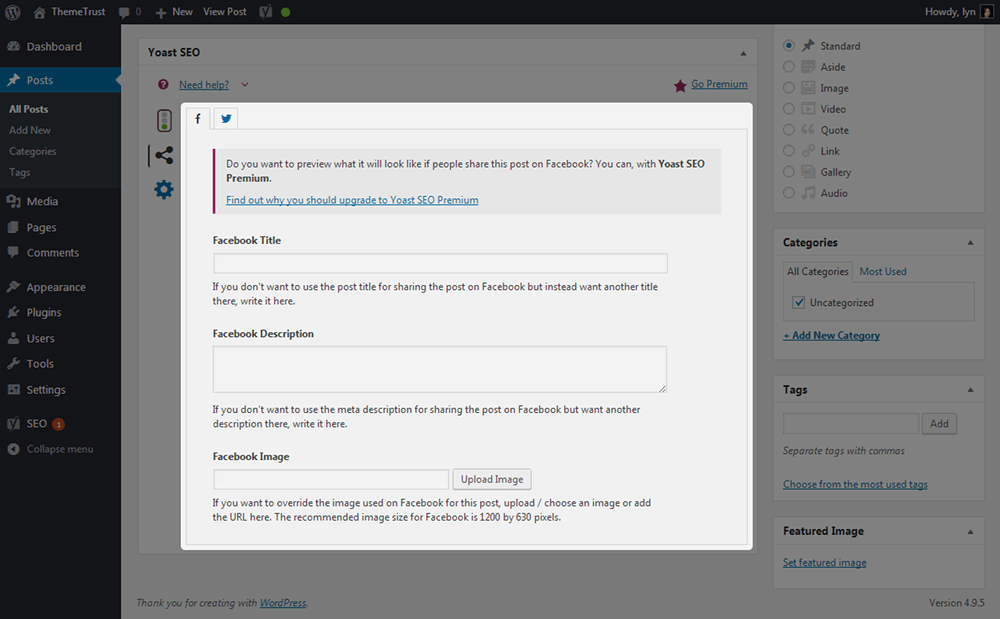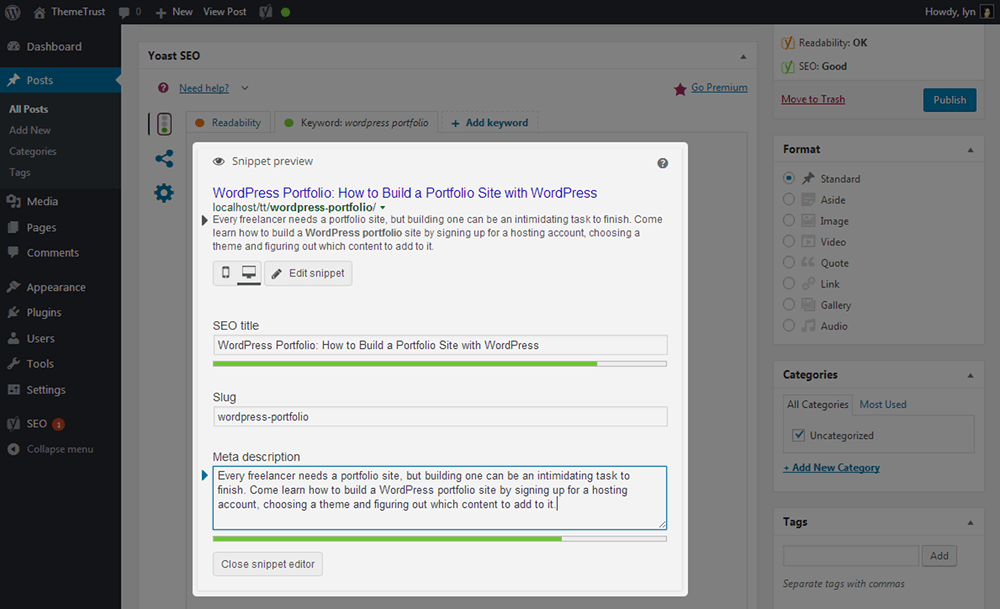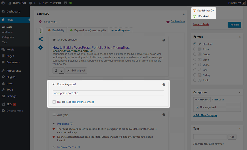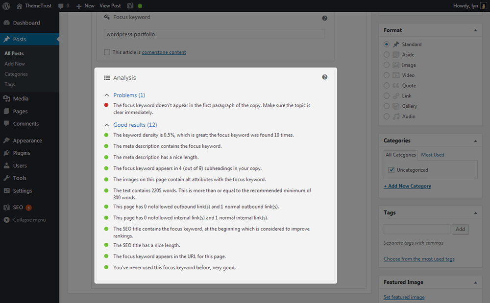 - SEO分析—要了解是否正确使用了主要关键字是很困难的。幸运的是,Yoast附带了一个SEO分析器,它允许您输入关键字,并让工具分析您的内容以对其进行评分。