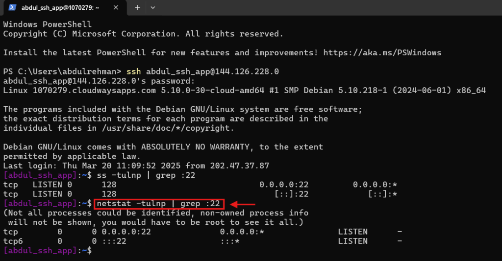 要检查 SSH 端口是否处于打开和监听状态,请运行