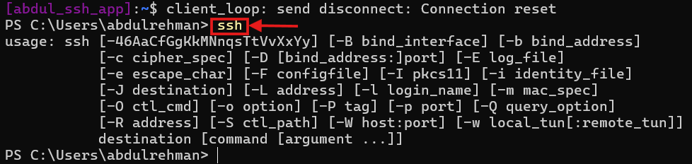 如果终端显示可用的 ssh 命令选项列表,则表明 SSH 客户端已安装在系统中。我的情况就是如此: