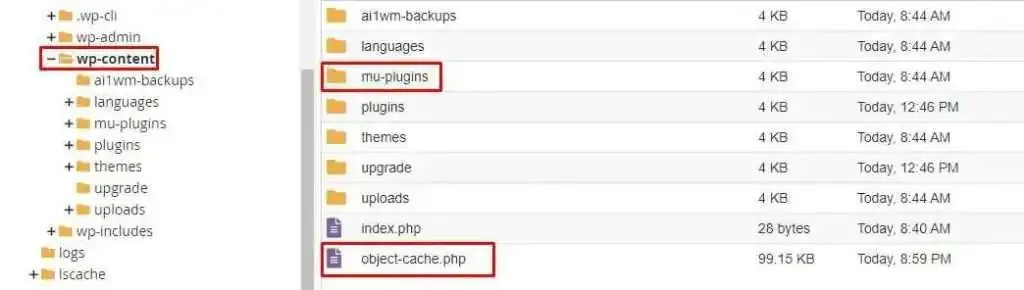 在这种情况下,进入 cPanel 文件管理器并进入 WordPress 网站 wp-content 文件夹,然后你可以找到类似这样的 mu-plugins 和自动生成的文件名 object-cache.php
