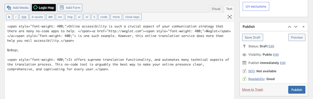 字符编码问题是经典编辑器用户需要经常处理的问题。为了提醒自己,请打开一个使用经典编辑器的旧 WordPress 安装,从 Google Docs 或 Word 中粘贴一些文本,然后在前端查看。然后,看看它在编辑器中是如何呈现的: