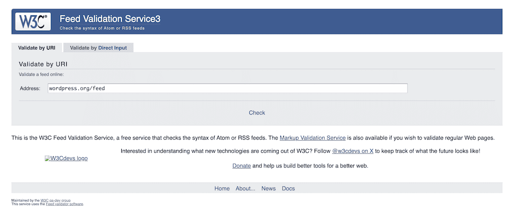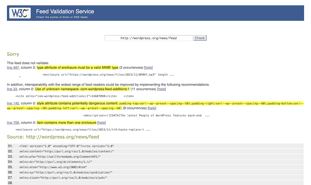 如果没有任何结果,但你仍然怀疑有问题,你可以使用订阅验证器。W3C Feed Validation Service 就是理想的选择。只需输入您的 feed URL,它就会列出任何错误或问题: