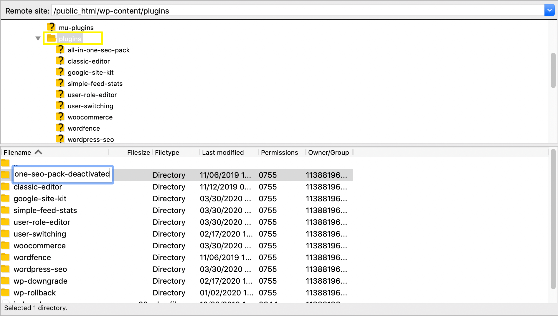 如果您无法访问您的仪表板,您可以使用FTP停用您的插件。只需导航到FTP 客户端中的wp-content > plugins并重命名每个文件夹: