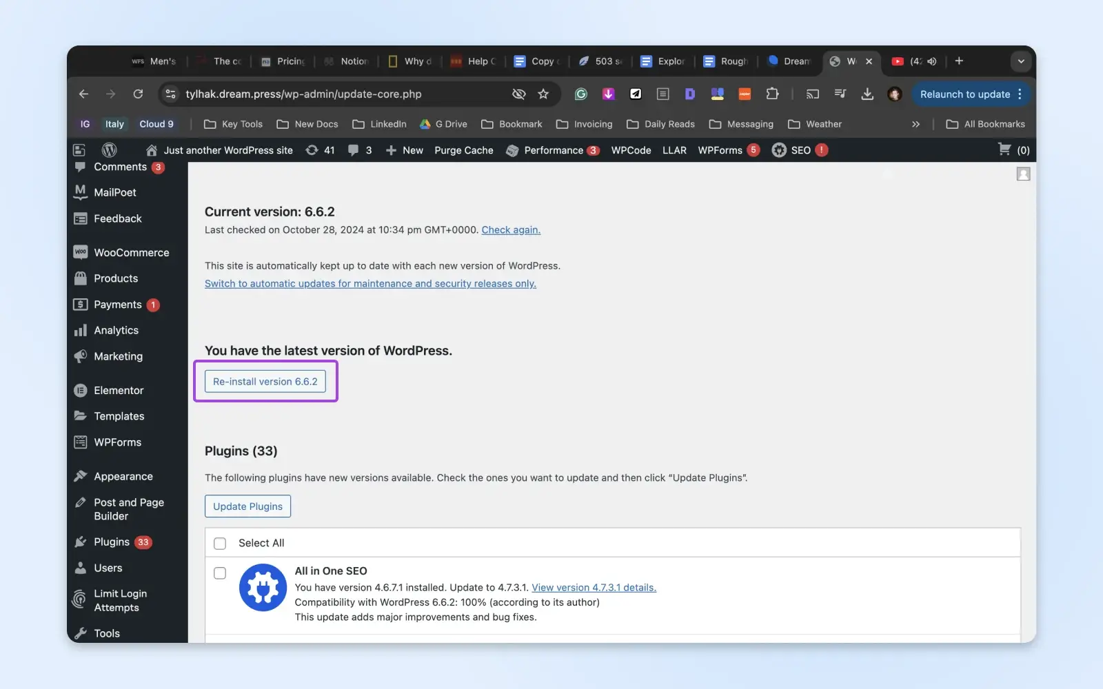 重新安装WordPress最简单的方法是通过仪表盘。转到控制面板 > 更新 。然后点击重新安装 6.6.2 版(或正在运行的版本):