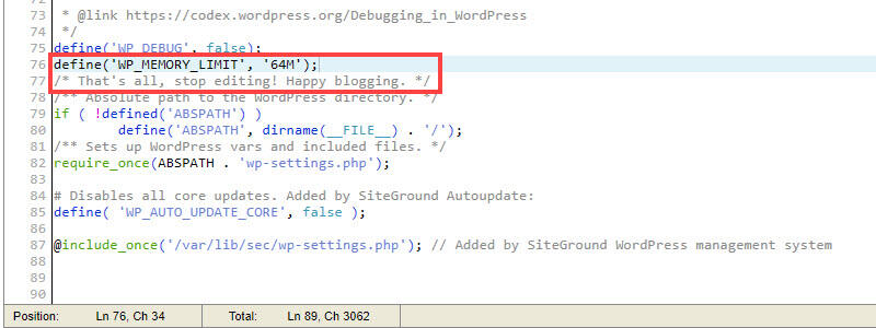 如果你没有找到它,你可以把它复制/粘贴到/* That’s all, stop editing! Happy blogging. */. 然后将64M调整为128M或256M 。这样做将更改WordPress网站的最大文件上传大小(以兆字节为单位)。