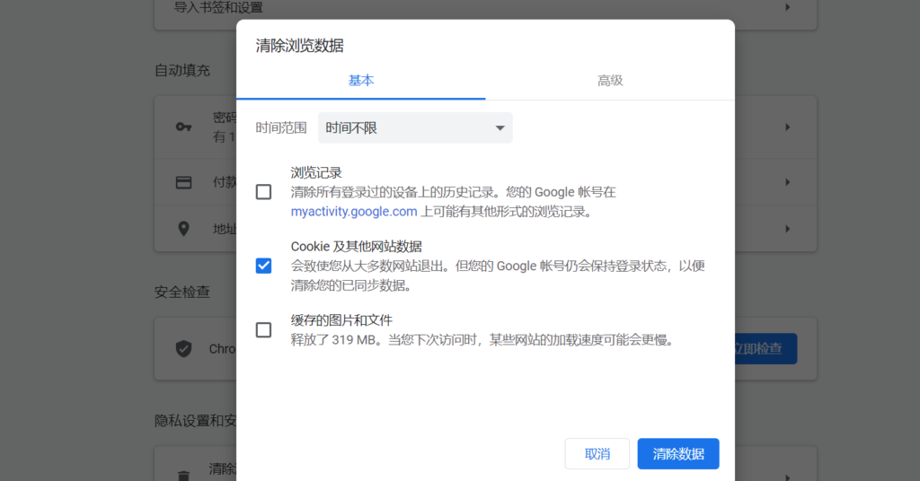 确保已选中Cookie和其他网站数据,然后为日期范围选项选择时间不限以删除所有当前网站Cookie。