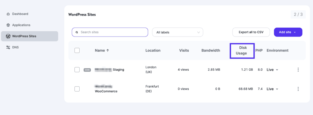 一旦你登录到你的账户,点击WordPress Sites标签。然后,在 “Disk Usage“一栏中查看: