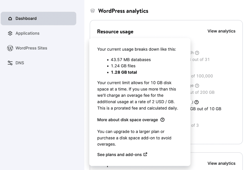 你的资源使用情况也会出现在特定网站的Analytics部分。进入Resources > Disk space,查看你的存储限制和当前使用情况: