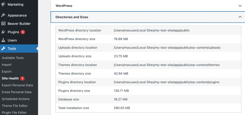 无论您使用的是哪一个主机服务器的产品,你可以在你的WordPress仪表板上跟踪这些信息。进入工具>站点健康>信息,找到目录和大小。