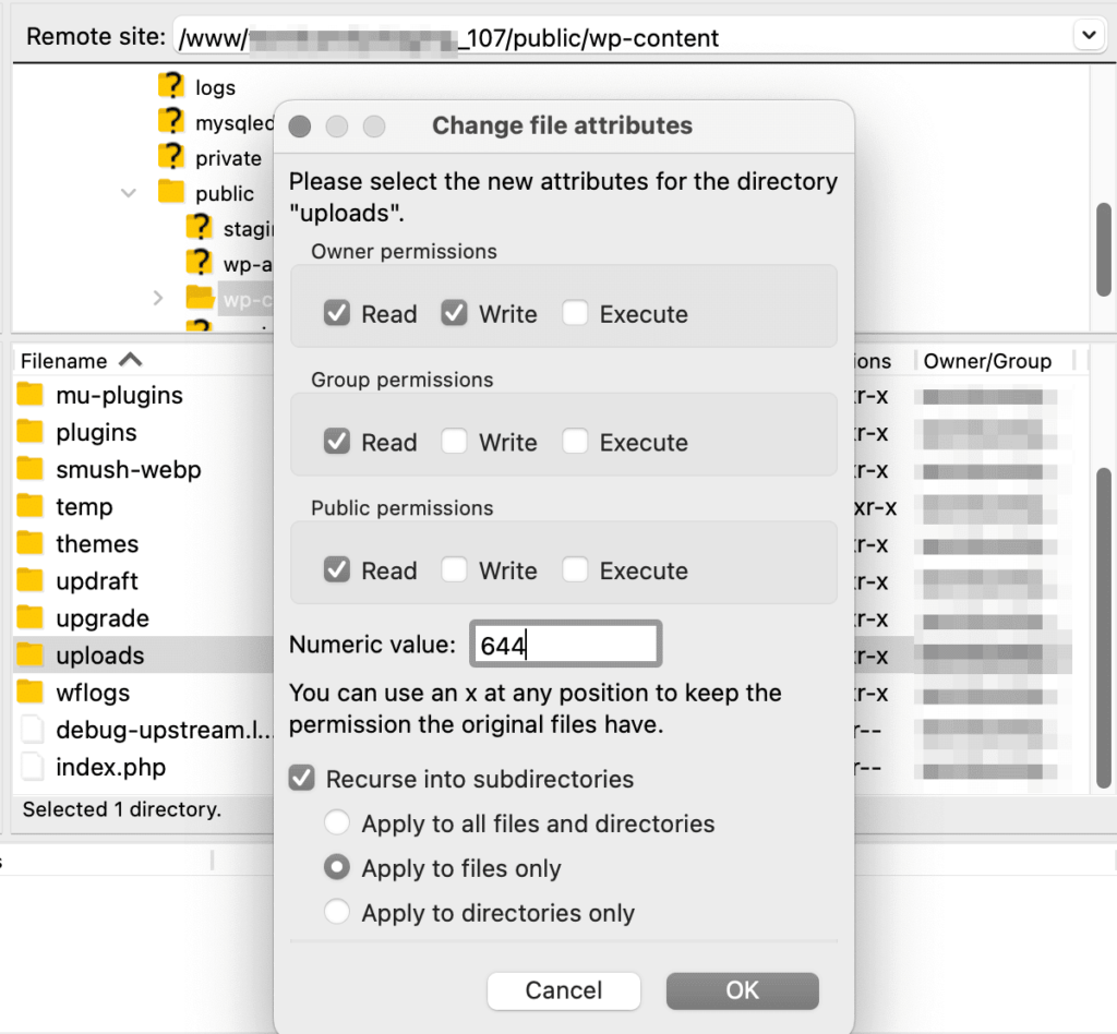 要做到这一点,将数字值设置为’644’。你还需要选择 “递归处理子目录“和 “只应用到文件“: