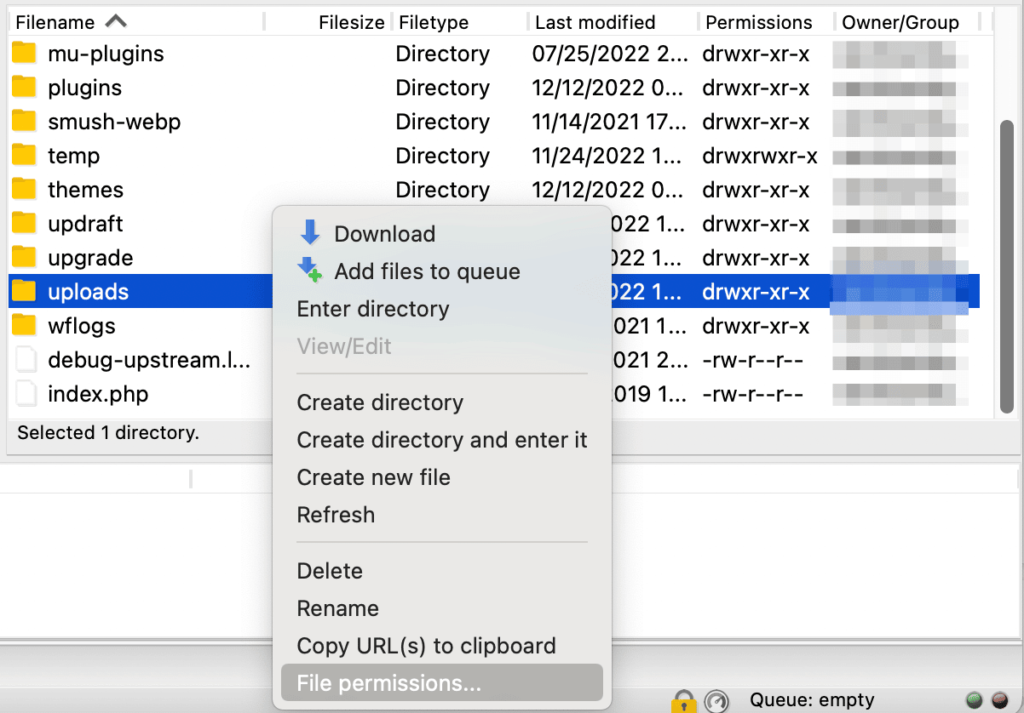 要解决这个问题,你需要重新连接到你的SFTP客户端。然后,导航到public > wp-content,右击uploads文件,并点击文件权限: