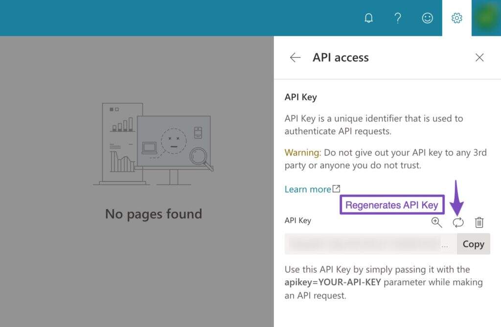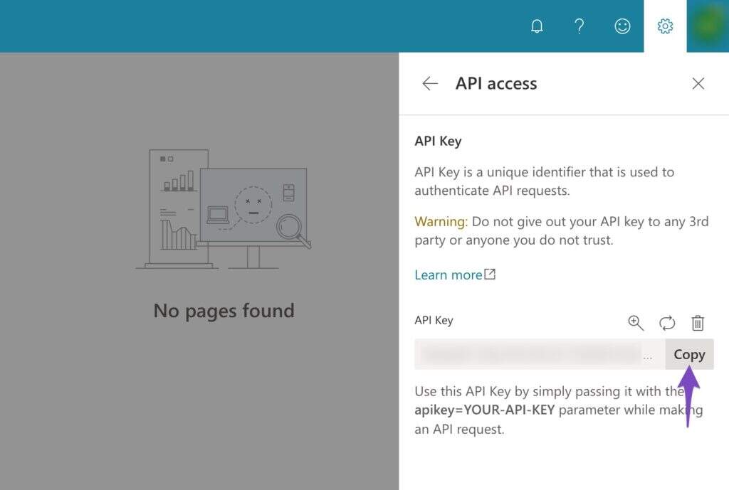 要获得与您的Bing账户相关的API密钥,请前往Bing网站管理员工具账户内的设置>API访问>API密钥,然后点击复制按钮。