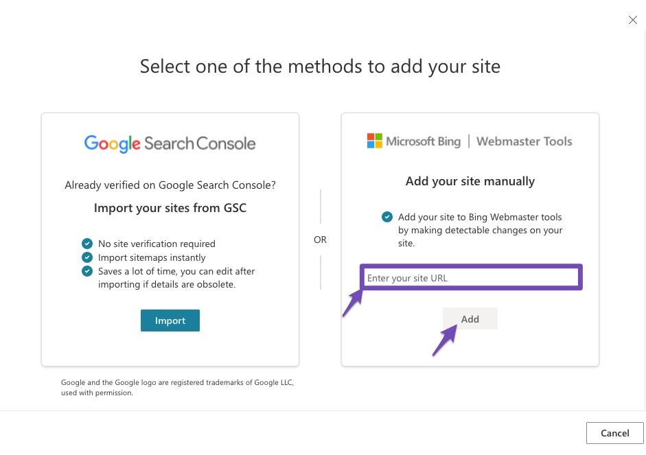 前往Bing网站管理员工具。我们假设你已经在Bing网站管理员工具有一个账户,如果没有,你可以随时用你选择的任何电子邮件地址创建一个。要手动将您的网站添加到Bing网站管理员工具,请输入您网站的URL,然后点击Add按钮。