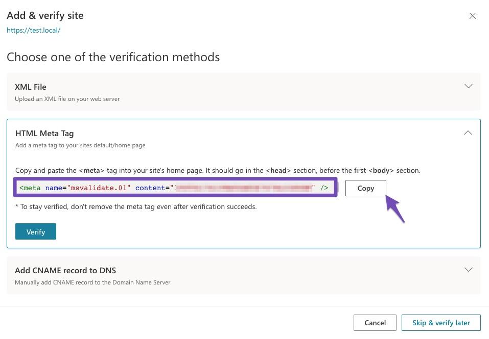 在下一页,你会看到各种选项来验证你的网站。我们建议使用HTML元标签方法,因为你可以用Smart SEO Tool插件或者其他提供添加Header代码的主题插件轻松地添加所需的元标签。复制元标签的内容部分。