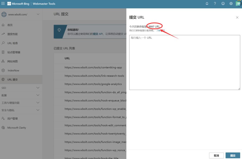 您可以进入您的Bing站长管理工具,点击左侧菜单“URL提交”,即可查看您的配额剩余数量。