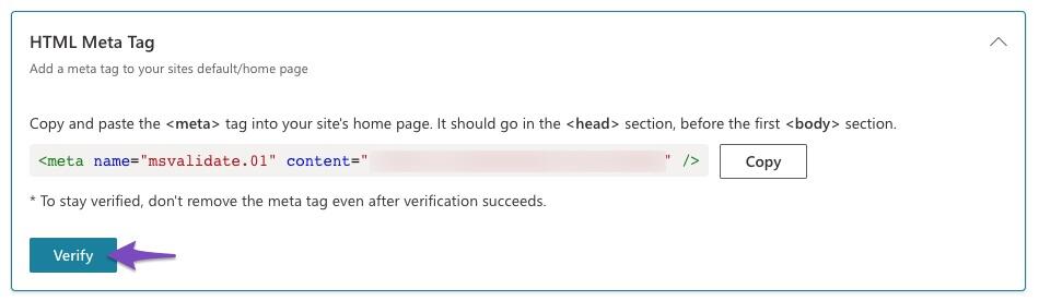 然后回到Bing网站管理员工具,然后点击Verify按钮,现在你的网站应该被验证了。如果Bing无法在你的网站上找到验证码,那么请确保你已经清除了浏览器的缓存。